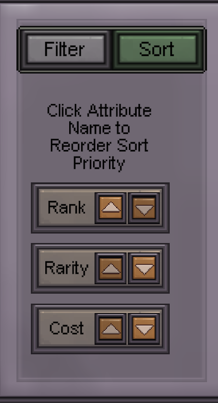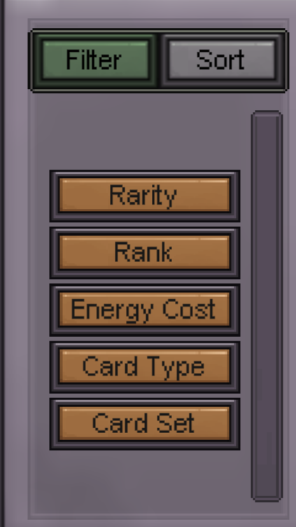 왼쪽의 Filter(필터)는 내가 원하는 속성을 가진 카드만보게 해주고, Sort(정렬)은 랭크, 레어도, 코스트에 따라 카드를 정렬해서 볼 수 있게 해줍니다.