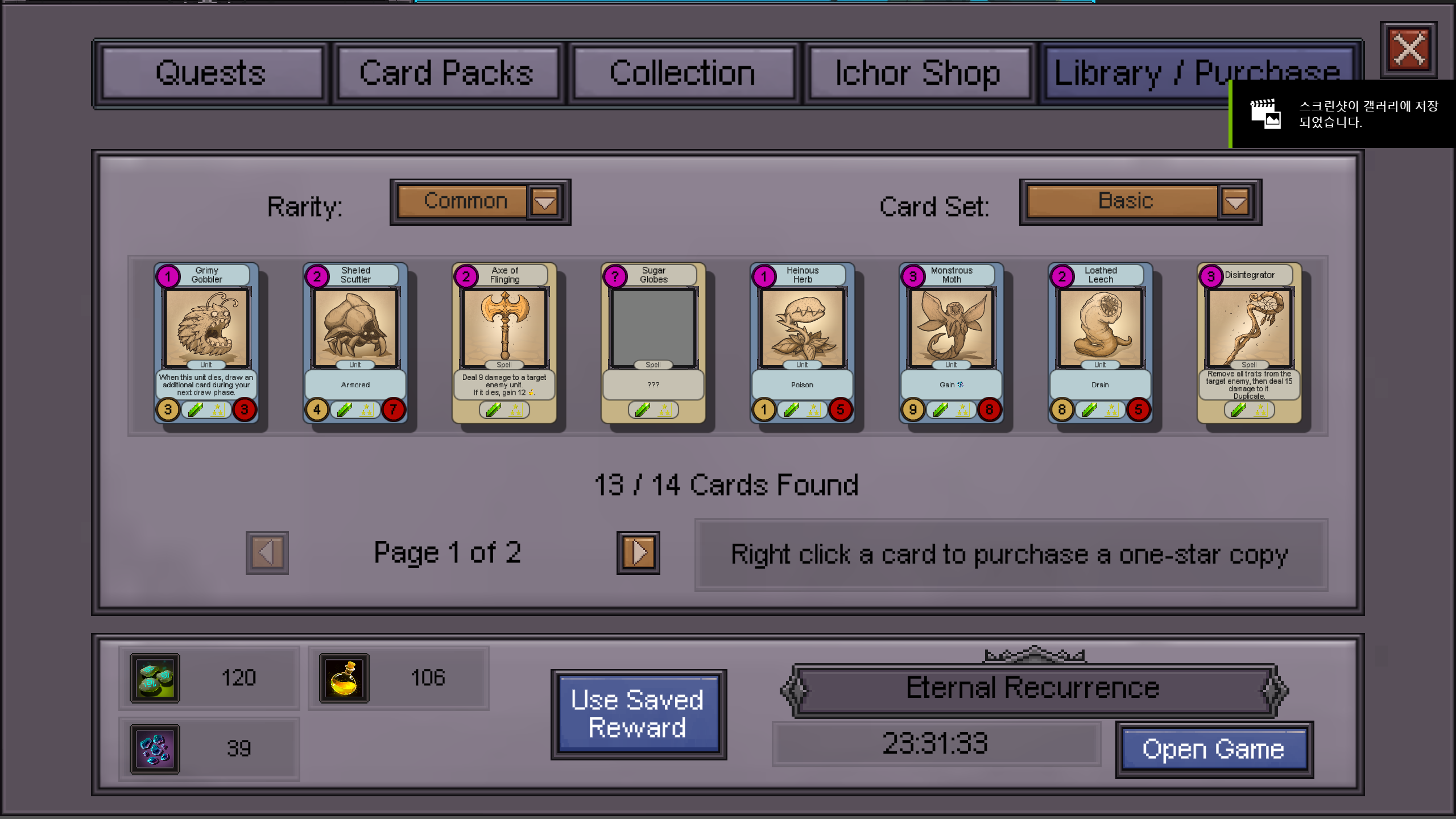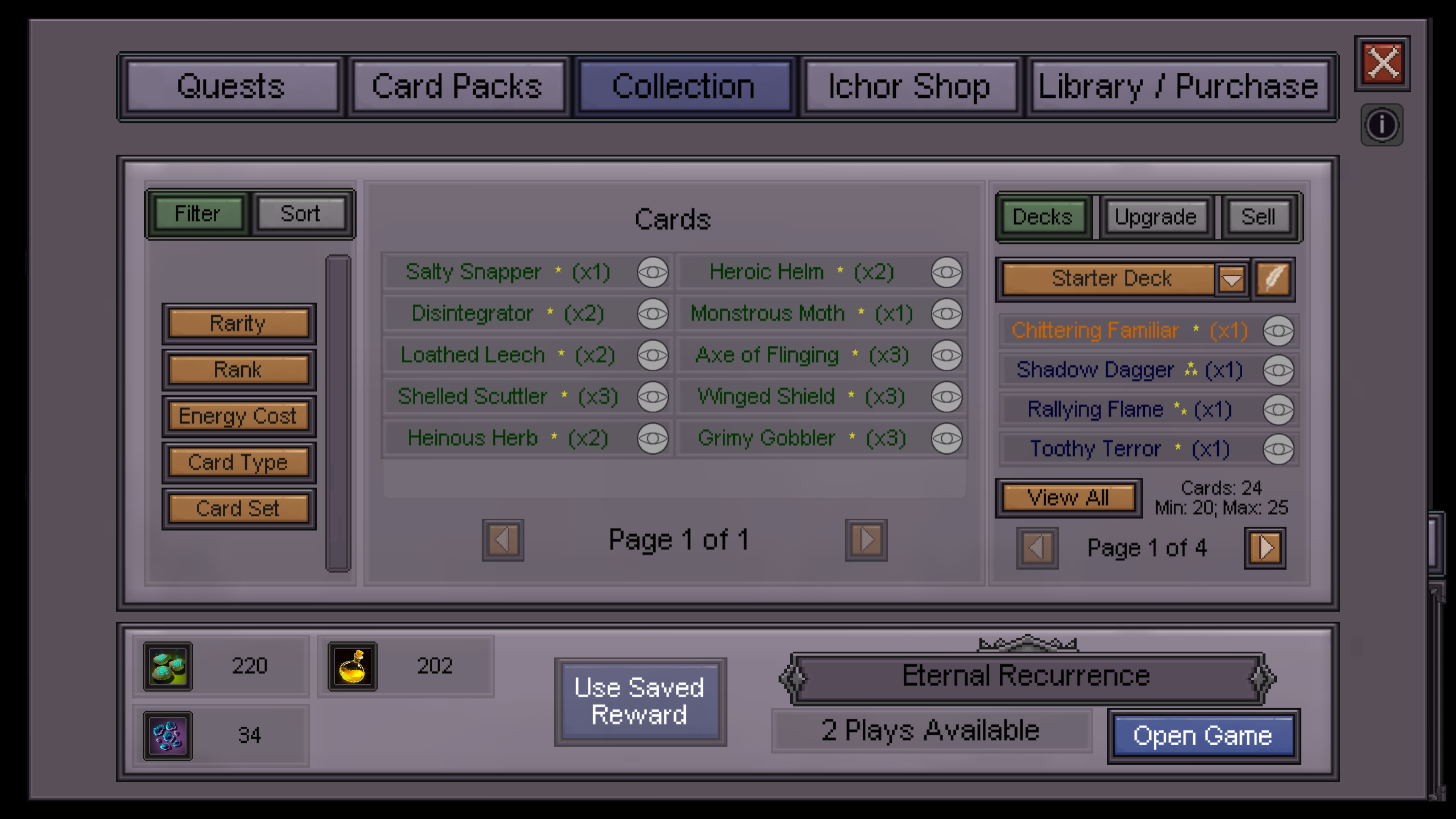콜렉션 칸에서는 현재 가지고 있는 카드를 확인하고 덱을 짜거나, 카드를 업그레이드 또는 판매 할 수 있습니다.