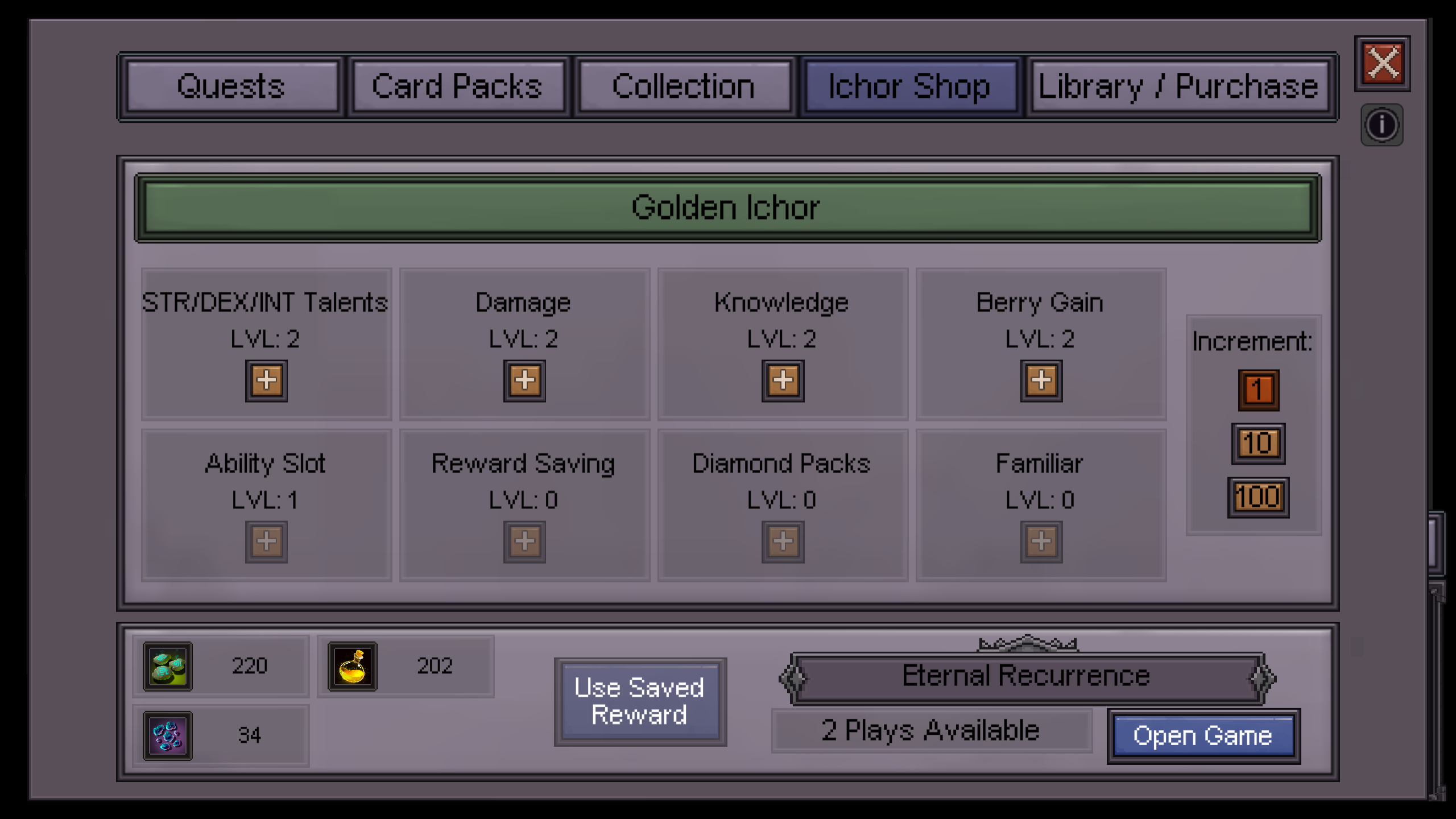 Ichor Shop에서는 Golden Ichor 라는 재화를 이용해 본게임에 도움이 되는 여러가지 보너스를 구매할 수 있습니다.