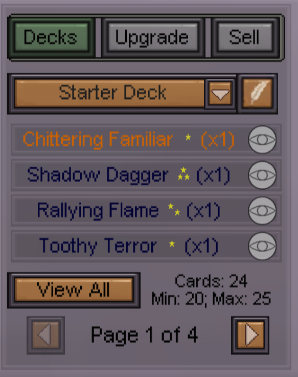 Decks(덱) 에서는 현재 나의 카드덱을 볼 수 있습니다. 카드덱은 최소 20장, 최대 25장으로 이루어져야합니다.