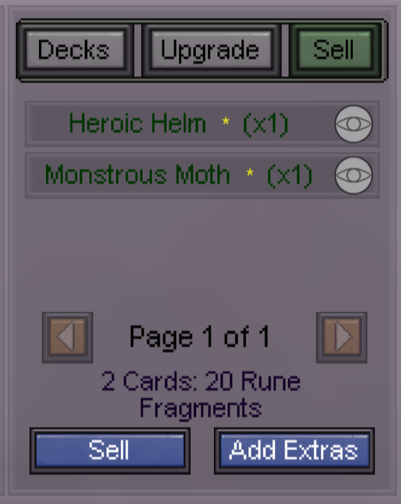 Sell(판매)에서는 내게 필요없는 카드를 팔 수 있습니다. 보상으로 Rune Fragments를 얻습니다.