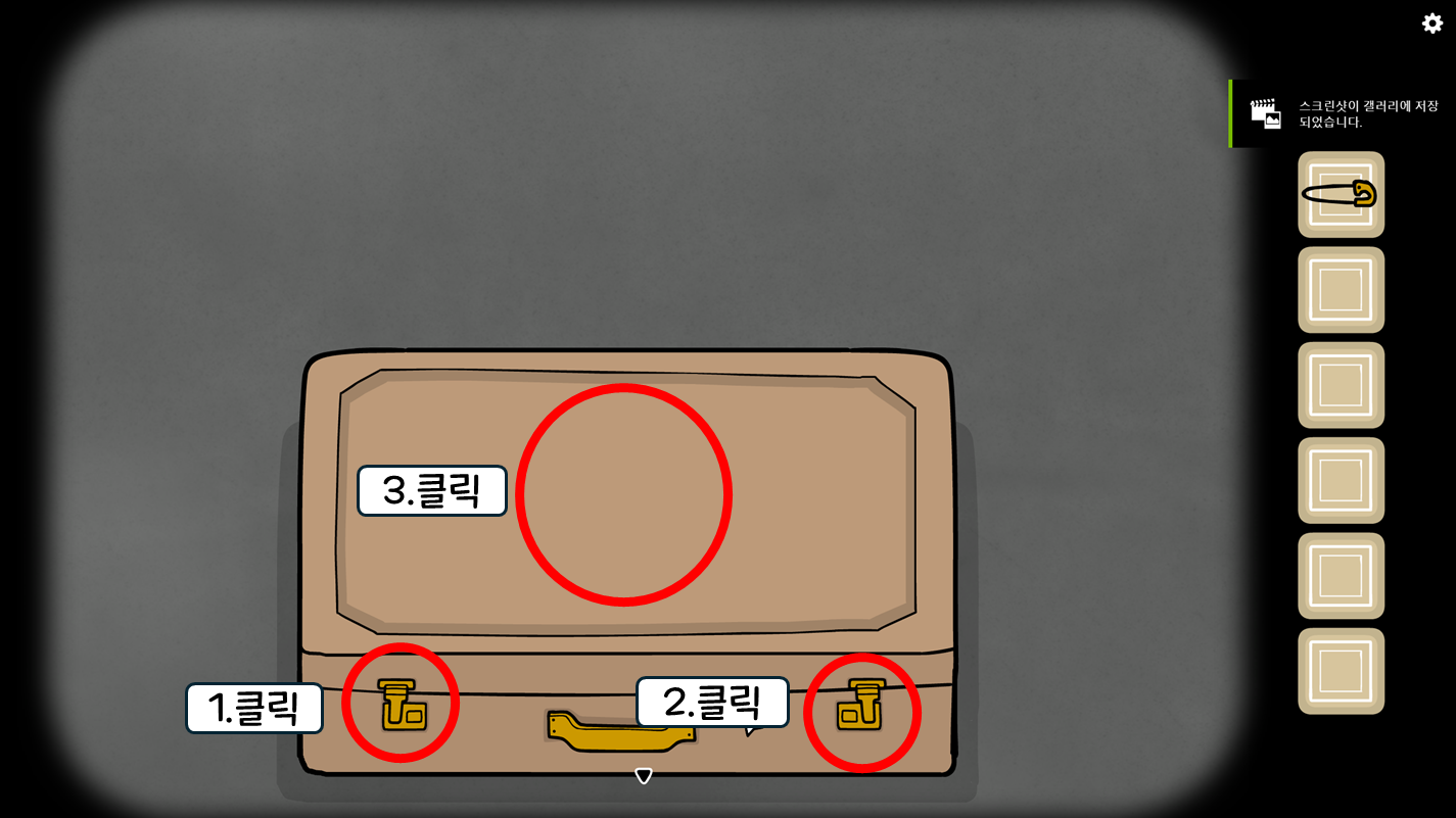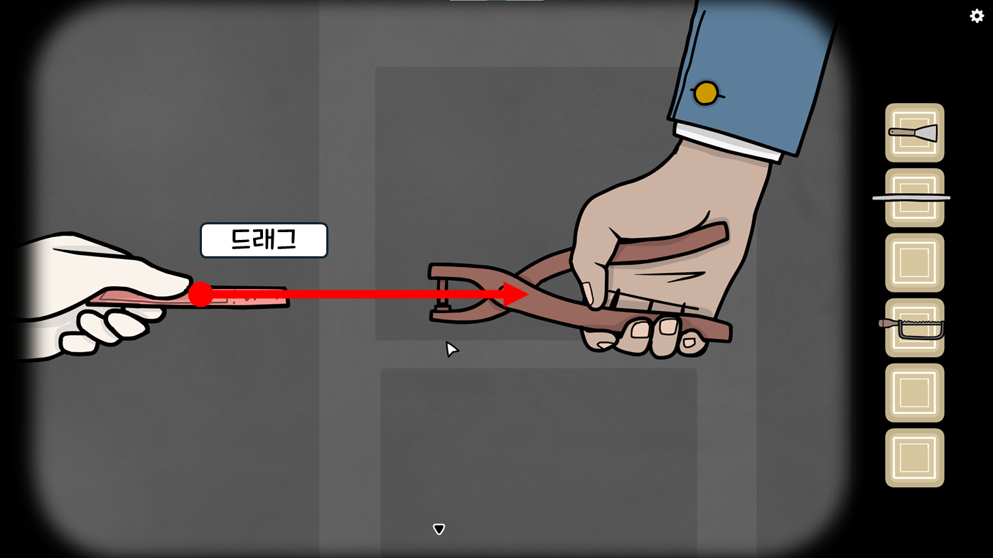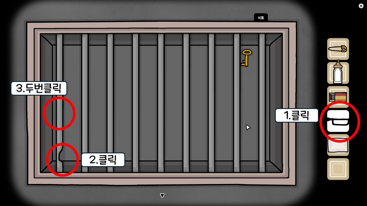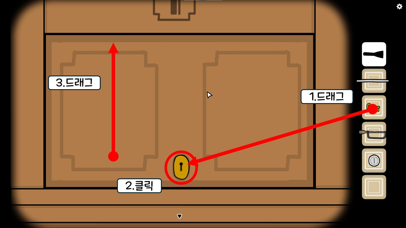 열쇠를 열쇠구멍에 드래그 한 뒤 열쇠를 클릭하면 잠금이 해제 되고 창구판자를 위로 드래그해 창구를 열어줍니다.