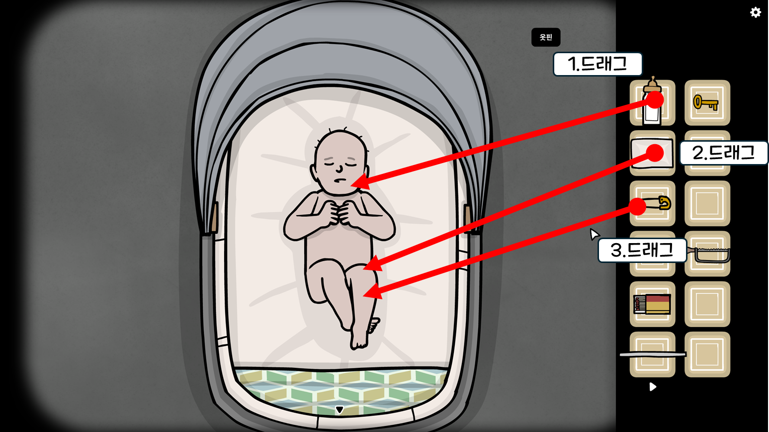 아기에게 우유가든 병, 천, 클립을 순서대로 드래그해서 놓아줍니다.