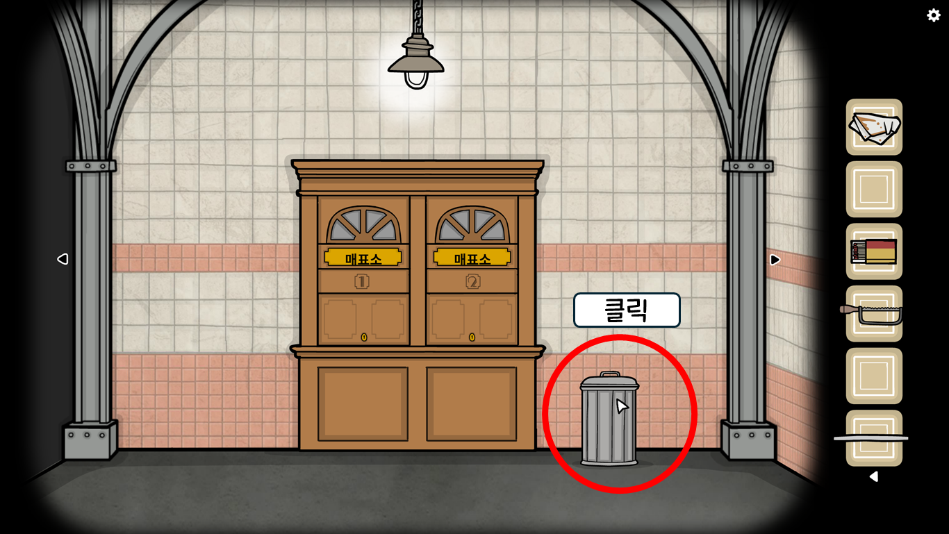 이제 매표소가 있는 벽으로 와서 매표소 오른쪽의 쓰레기통을 선택해줍니다.