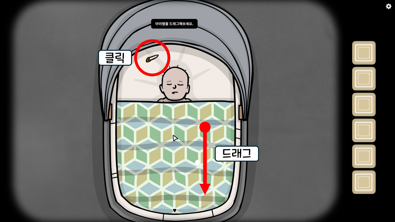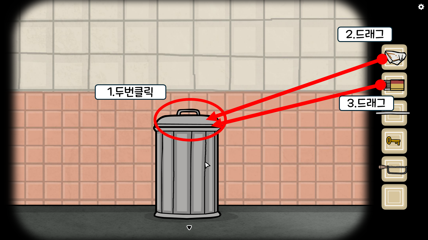 쓰레기통 뚜껑을 두번 클릭해서 열어준 뒤 더러워진 귀저귀와 성냥을 순서대로 통으로 드래그해주면 통에 불이 붙습니다.