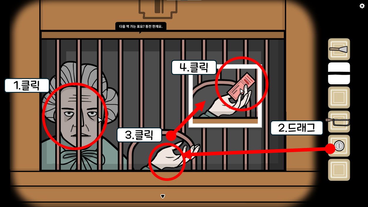 할머니를 클릭하면 손을 내미는데 손위로 동전을 드래그 하고 손을 클릭하면 지하철 표를 줍니다. 클릭하여 획득합니다.