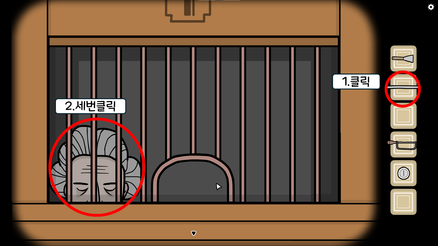 자고있는 할머니를 깨우기 위해 막대기를 클릭 후 할머니를 세번연속 클릭해줍니다. 그러면 할머니가 깨어납니다.