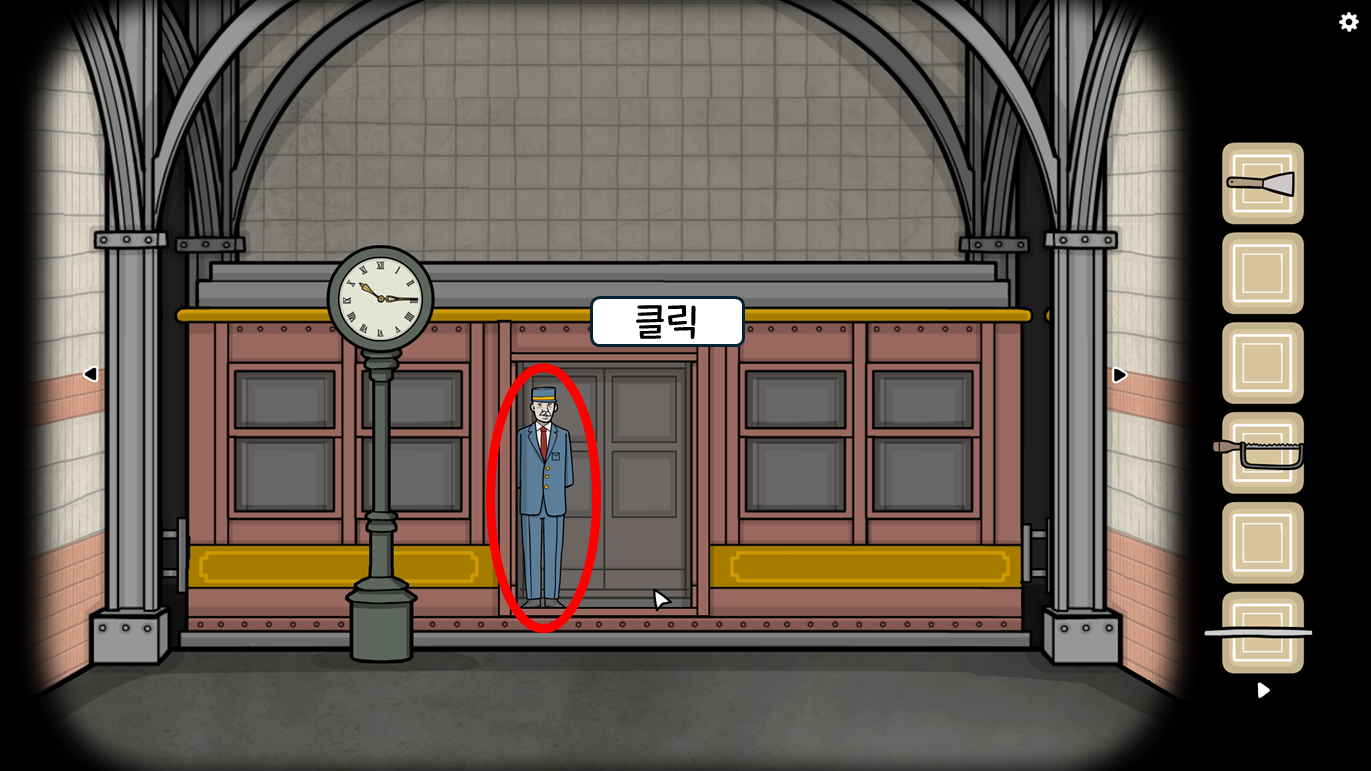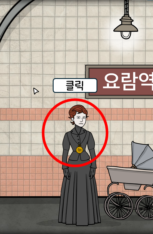 그럼 지하철이 오게되는데 지하철문을 클릭하고 안에 서있는 역무원을 클릭해줍니다.