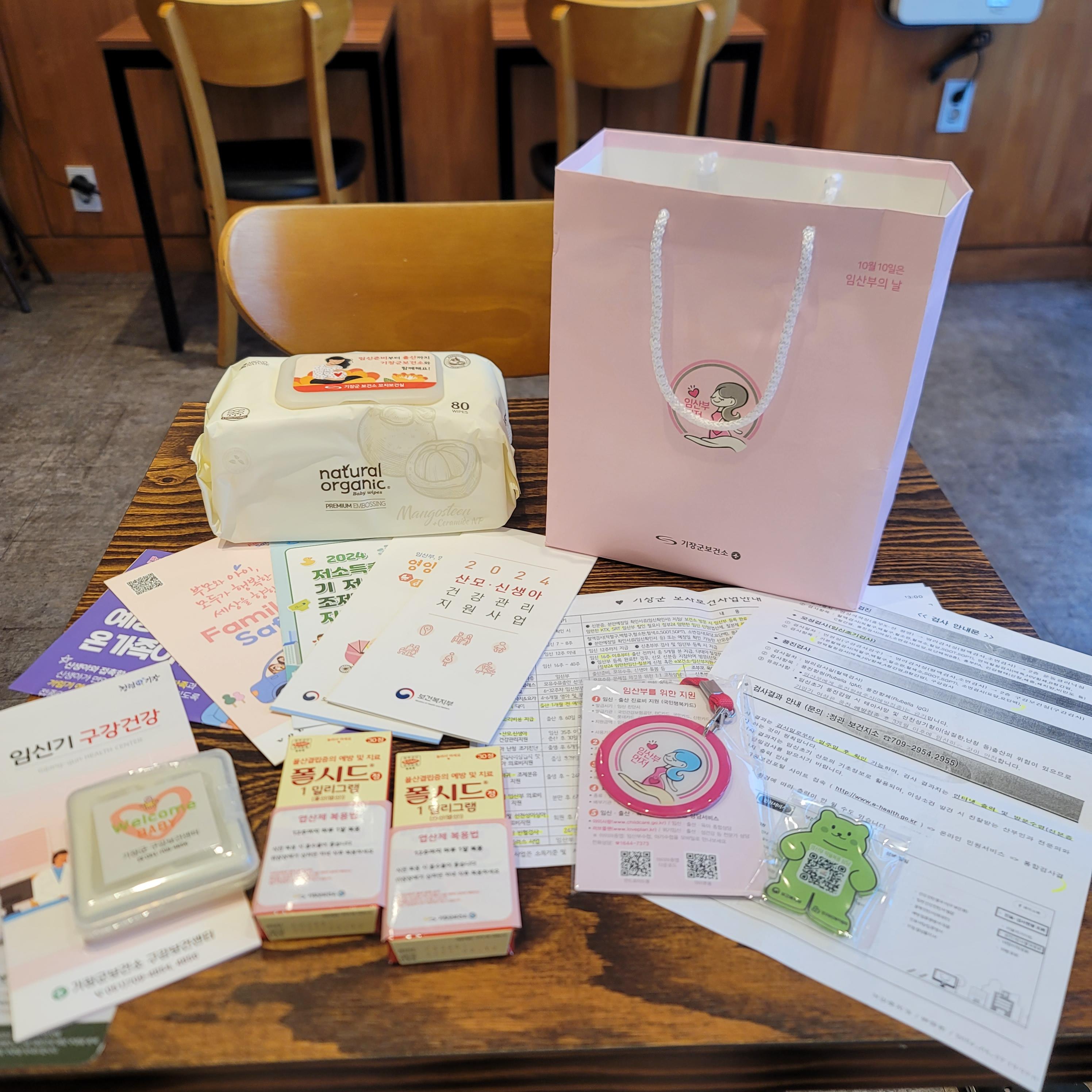 그리고 임산부를 위한 각종 지원제도를 설명하는 팜플렛들과 물티슈, 임산부 상담관련 QR이 적힌 자석을 받았습니다.
