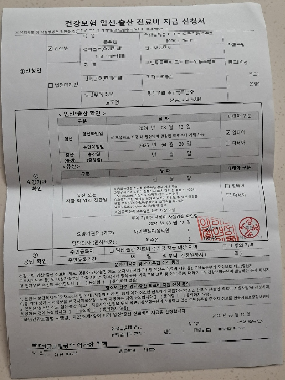 저는 가져온 건강보험 임신출산 진료비 지급신청서를 드리고 서류 하나를 작성하고 그동안 아내는 보건소에서 진행하는 임산부 기초검사(임신초기검사)를 진행했습니다.