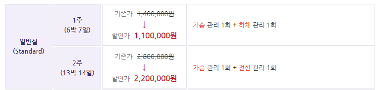 일반실 2주에 포함된건 가슴관리 1회, 전신관리 1회인데 각각 8만원, 14만원으로 추가로 받을 수 있으니 아내보고 받고 싶으면 마음껏 받으라고 해놨다.