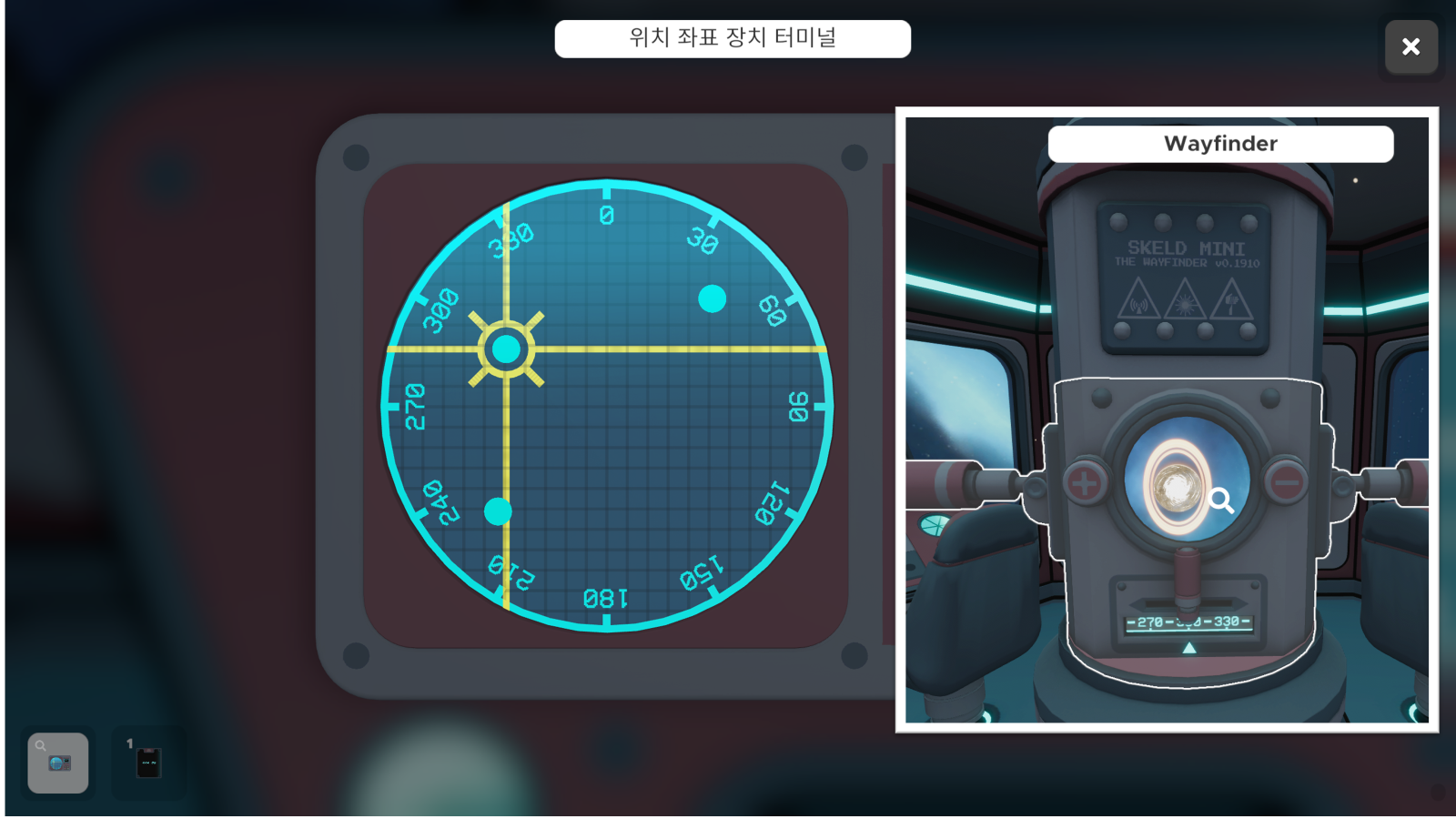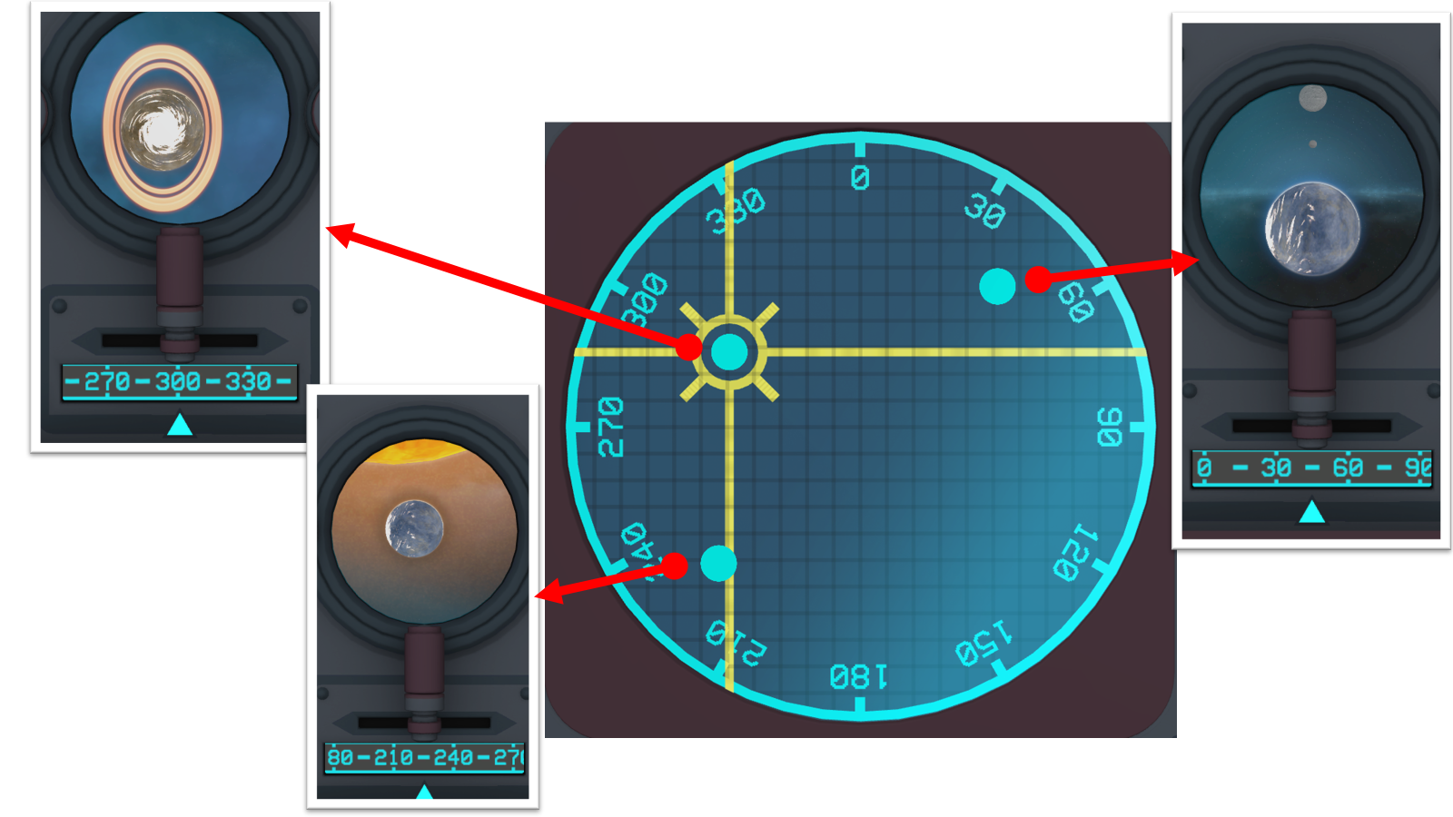 다시 위치좌표장치 터미널로 가면 3개의 행성이 보이는데 각각 300, 45, 225도 정도에 위치해있습니다.