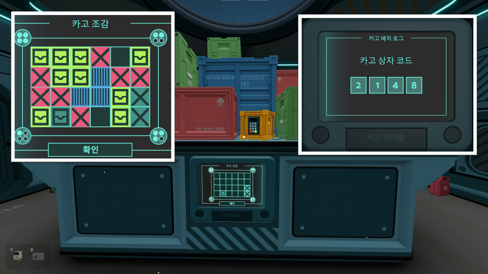 다시 앞으로 들어오면 패널이 활성화 되는데 왼쪽 위와 같이 맞춘 뒤 확인을 누르면 카고상자 코드를 얻을 수 있습니다.