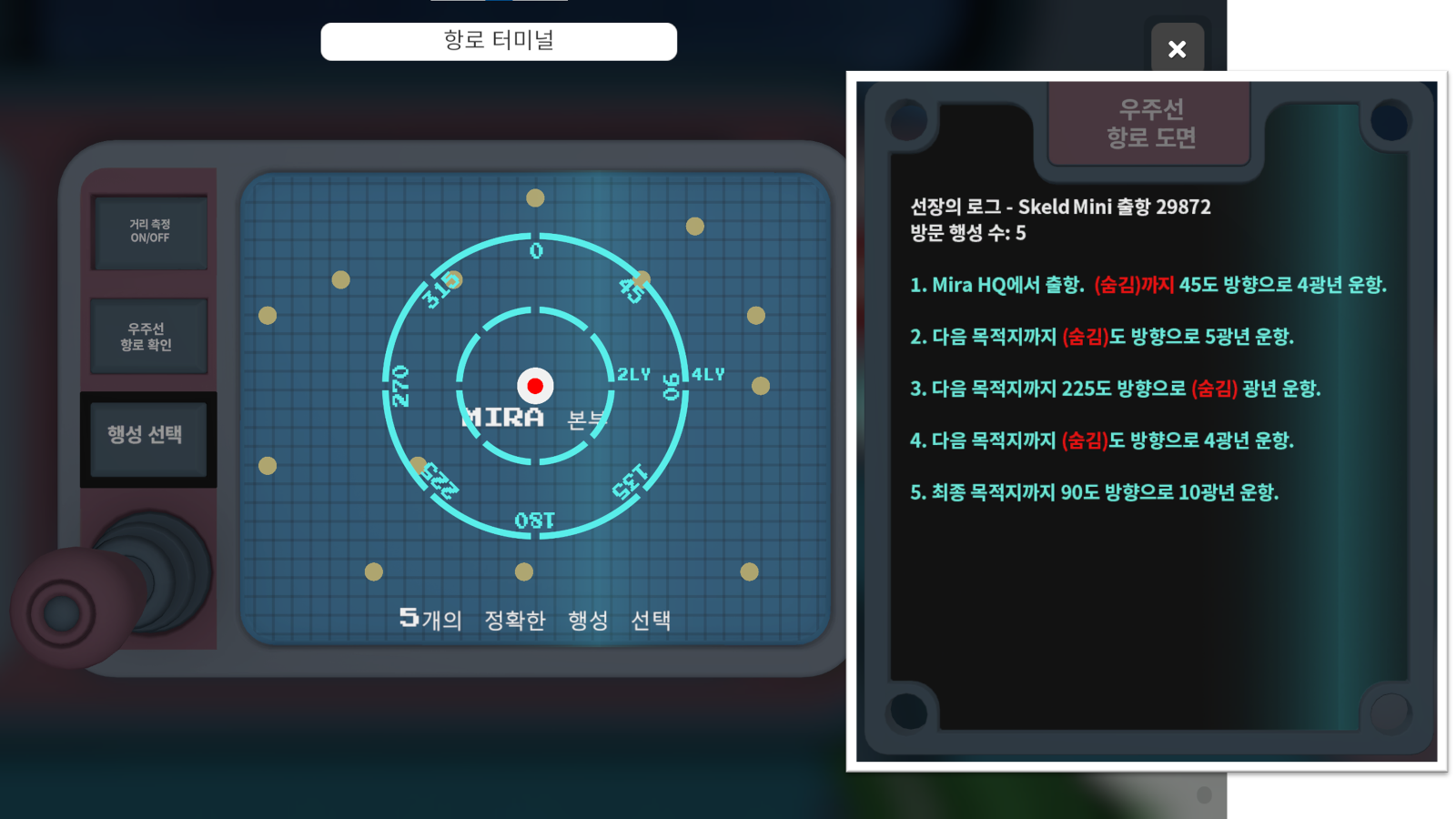 거르측정 ON,OFF를 키고 우주선 항로도면을 참고해서 목적지가 어디인지 입력해줘야합니다.