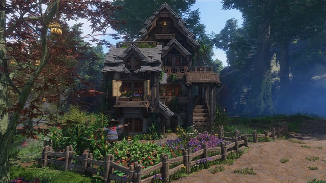 • 중세풍 자재(목재/석재/기와)로 마을·홀·성관 등 대형 구조.