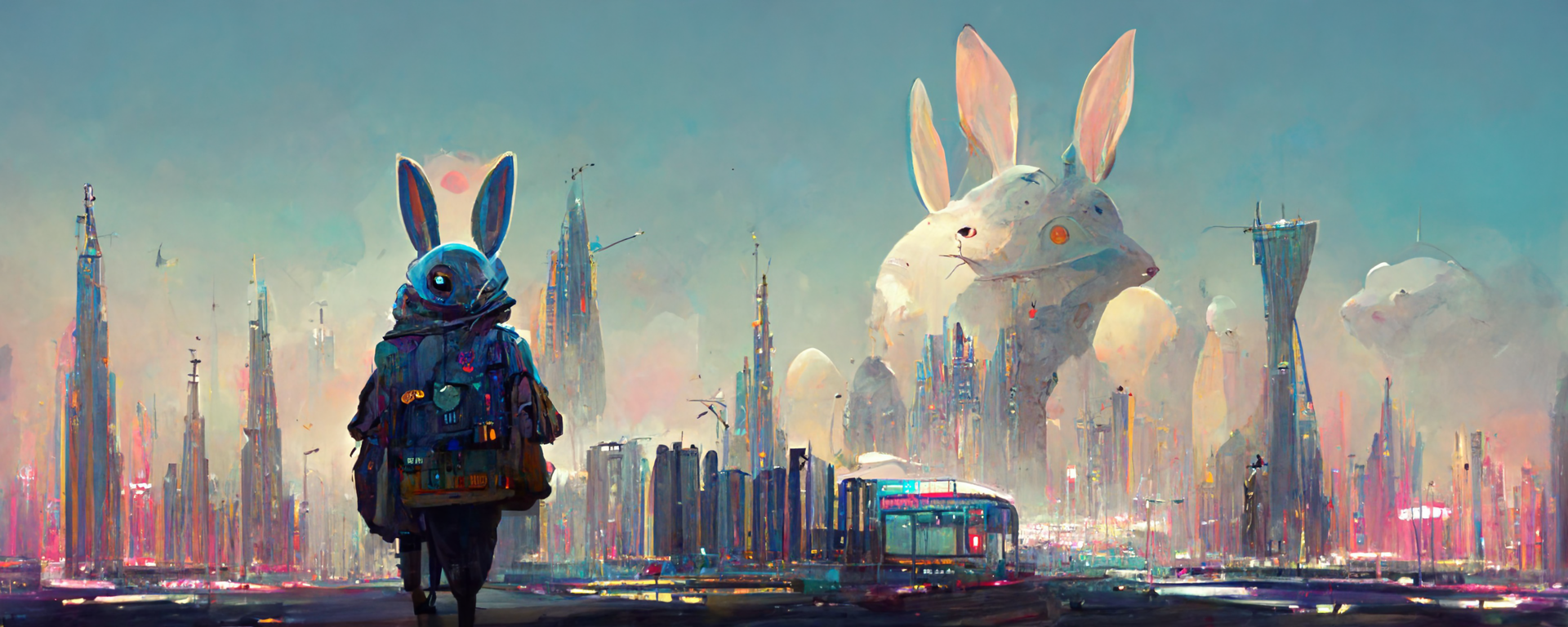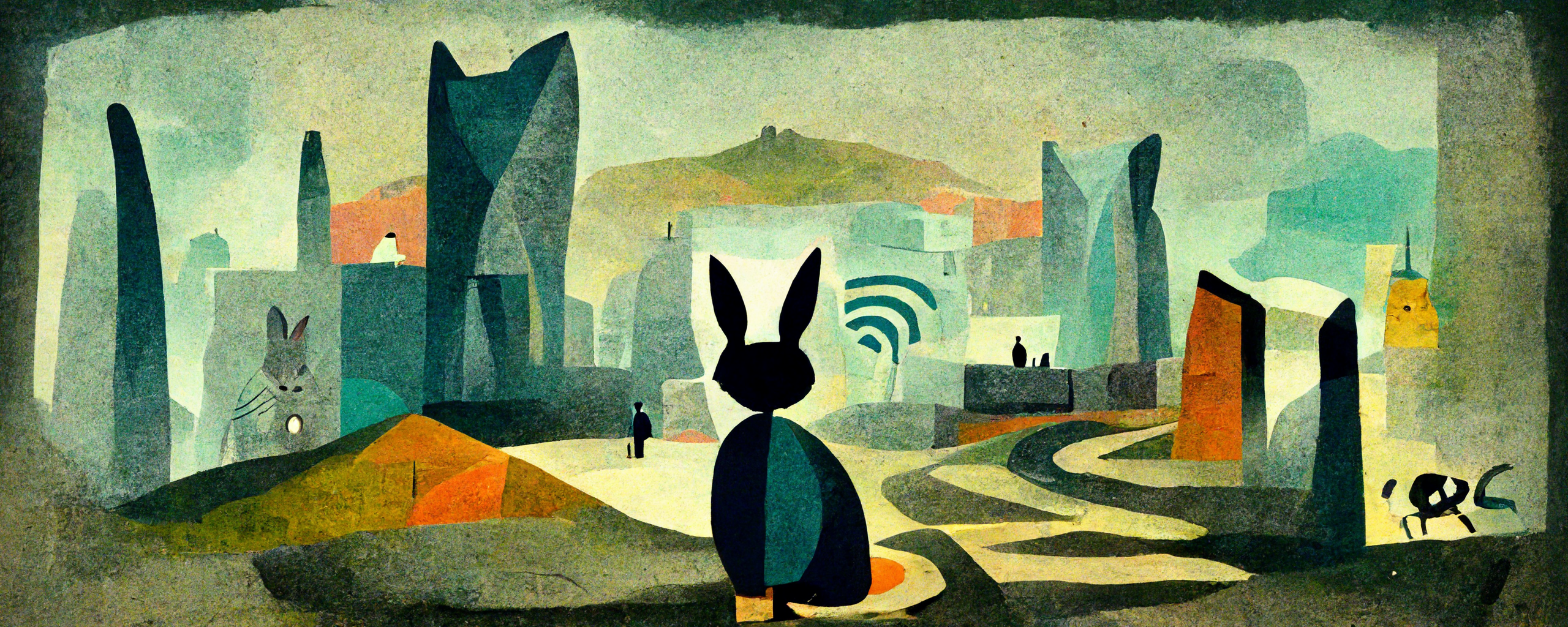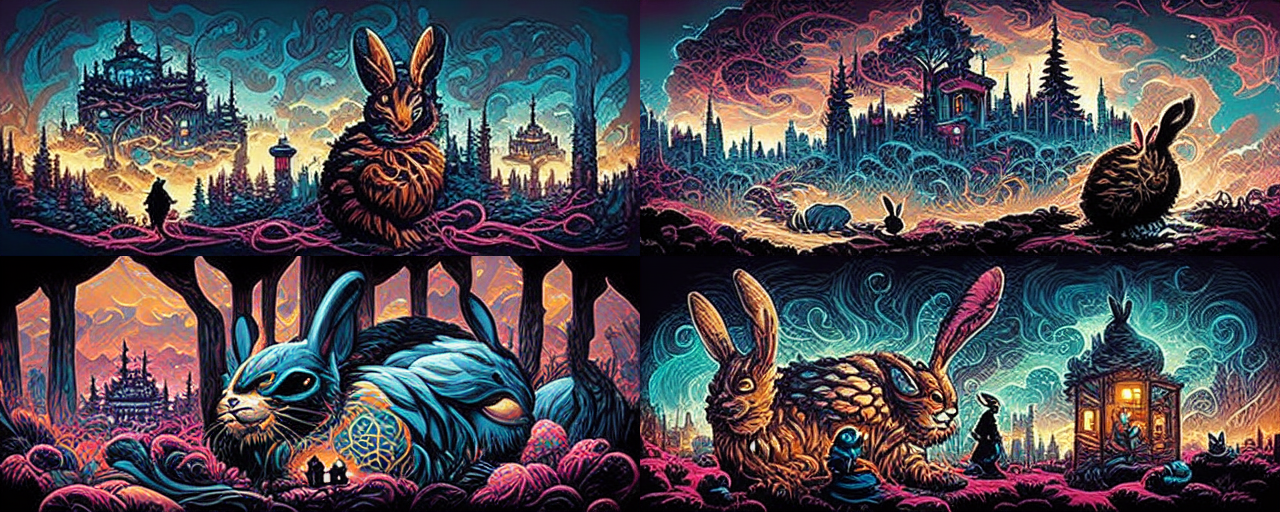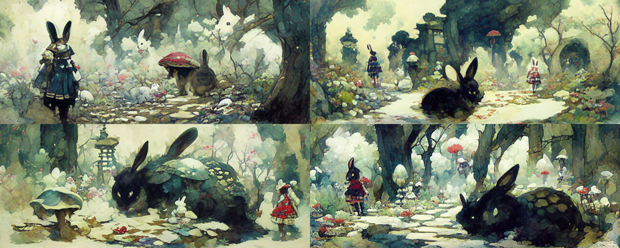 Rabbit wandering in Wonderland, Painting By 어쩌구, --ar 3:1 --q 2