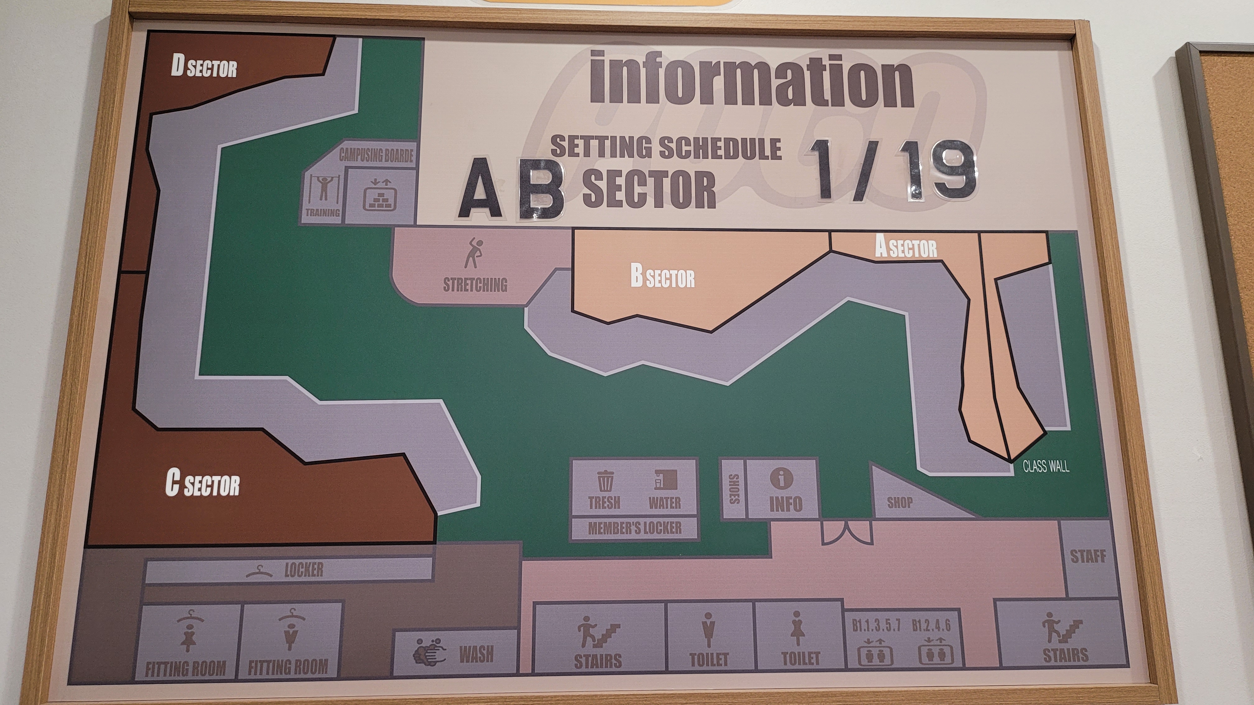 포고 클라이밍장의 벽은 강습벽, A/B/C/D 섹터로 나누어져 있어요.