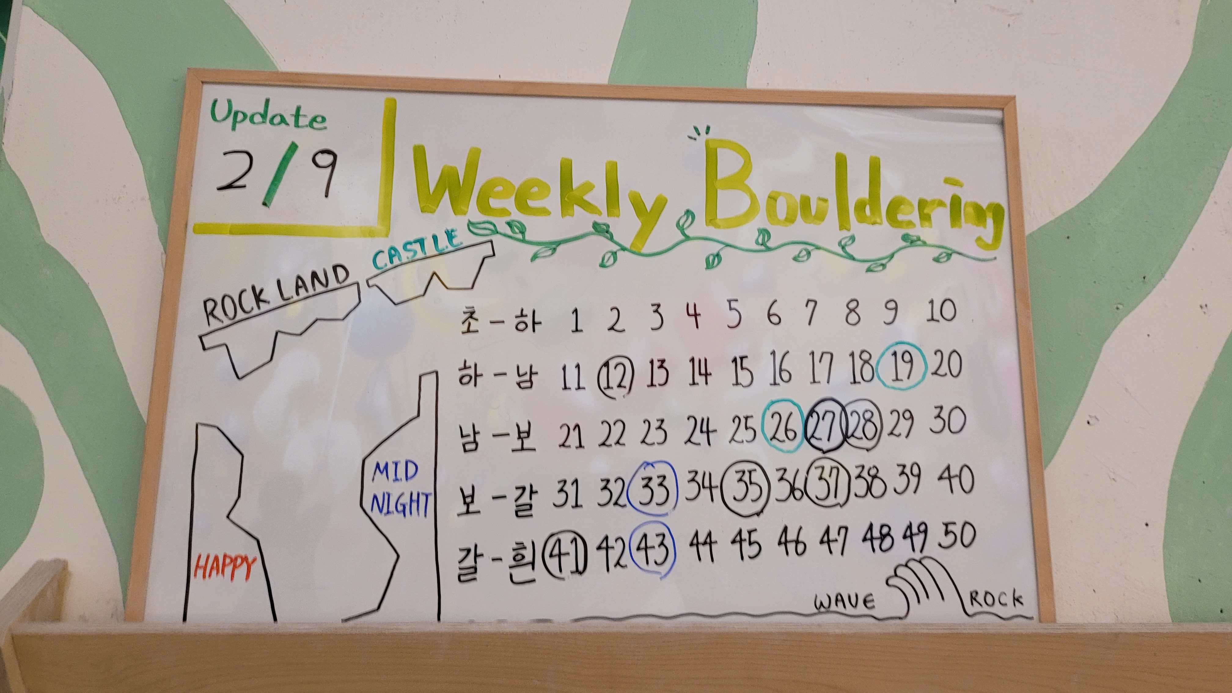 각 벽들은 2달에 한번씩 세팅이 바뀌고, 벽 세팅간 간격이 1달정도 되어서, 전체가 바뀔려면 대락 2달 반 ~ 3달 정도가 걸립니다.