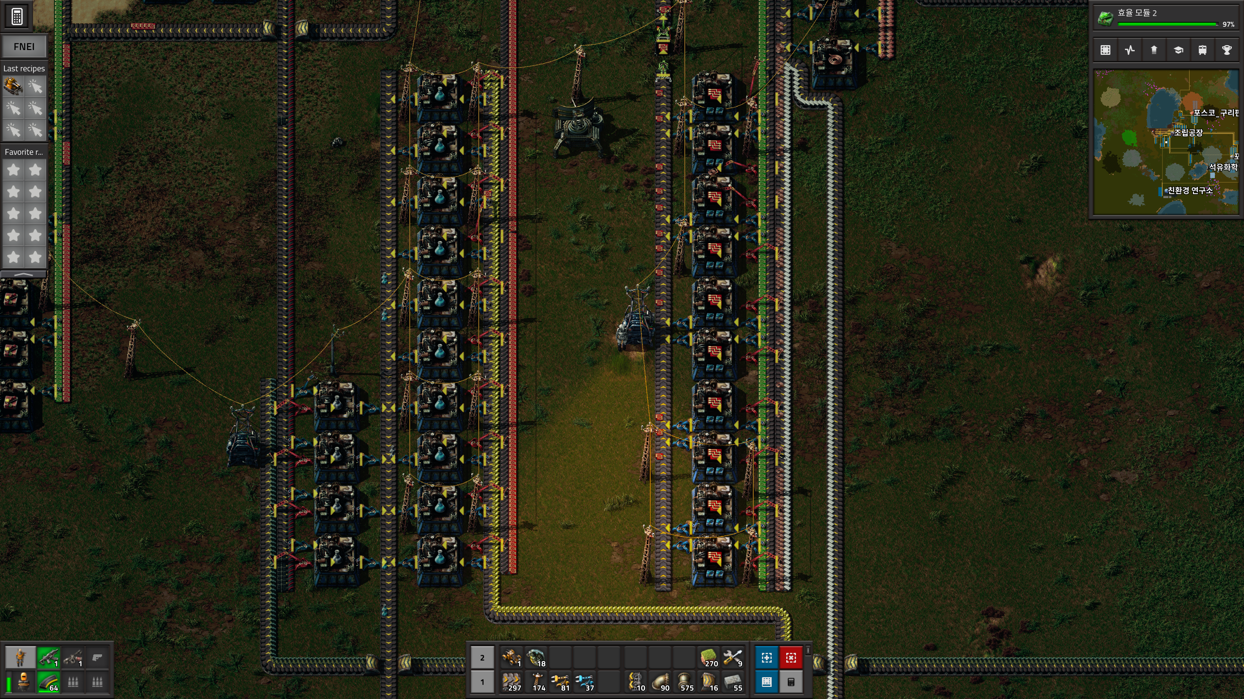 그래서 일단 임시방편으로 전기채굴기양을 늘리고 버퍼역할을 할 수 있는 벨트를 지그재그로 배치하였다.