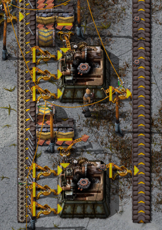 하나에 들어가는 재료가 많이 필요한데, 두줄로 재료를 공급하면 투입기 들어갈 공간이 3칸밖에 안되서 공급에 차질이 생기기 때문이다.