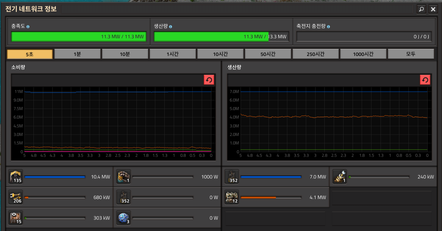문득 전기 소비량을 보니 생산량이 간당간당했다. 저것도 사실 철판이 지금 쓰일일이 없어서 채광드릴 몇개가 안돌고 있는 상태이니 아마 자동화를 본격적으로 시작하면 전기가 모자르는건 눈에 보이는 상황