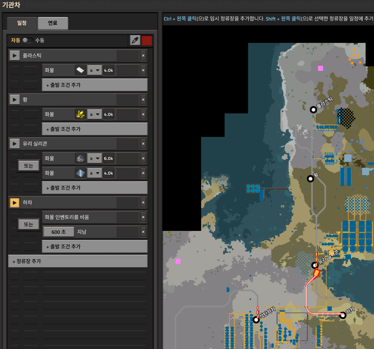 하차역에서 특이하게 600초가 지나면 출발하도록 해놨는데 그이유는 아까 강철창고중 하나라도 가득차게 되면 화물을 하적안하고 무한대기하는 상황이 발생하기 때문에 그걸 막고자 10분이 지나면 움직이게 만들어놓은것. 그러면 자원소비의 불균형이 일어나더라도 보상이 가능하다.