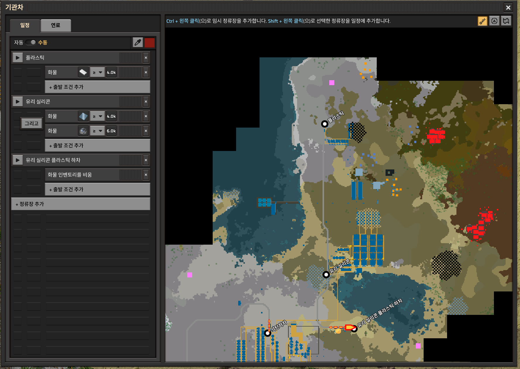 기관차를 클릭하여 역을 정하고 저렇게 일정을 짜놓으면 잘 왔다갔다한다.
