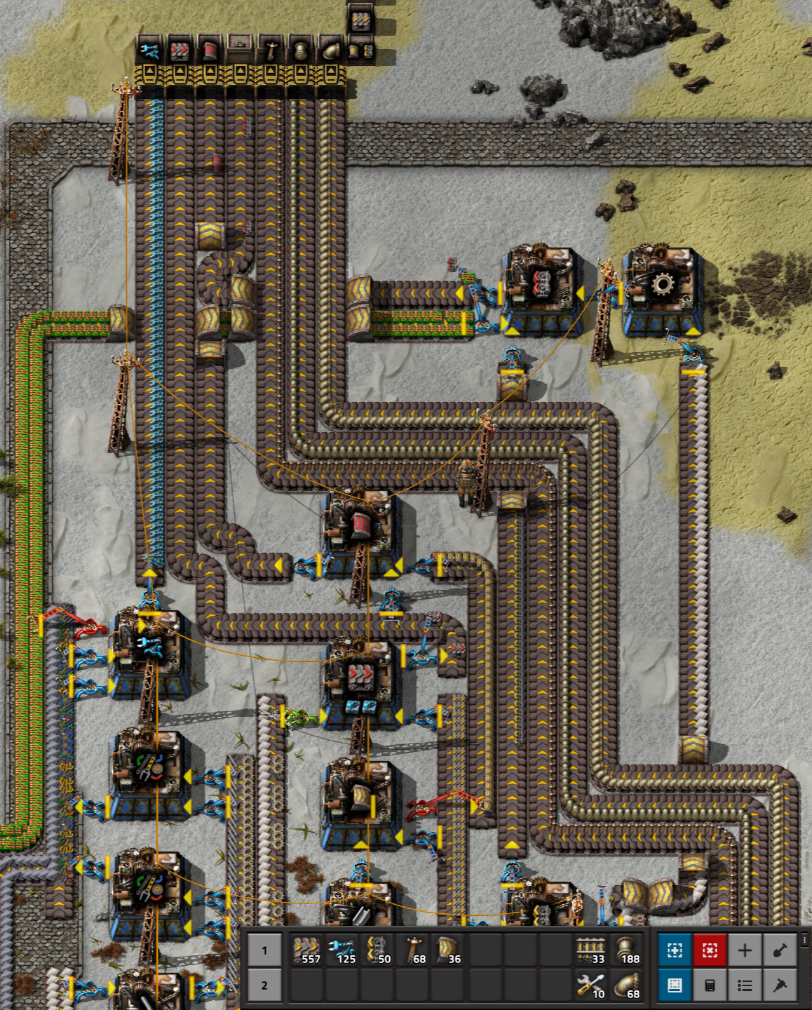 일단 군사테크카드는 군사업그레이드에만 쓰이기 때문에 많이 필요없고, 군사테크카드5개당 코크스는 1개밖에 안들기때문에 너저분하게 벨트를 연결하는것보다 저렇게 설치하는편이 더 낫다.