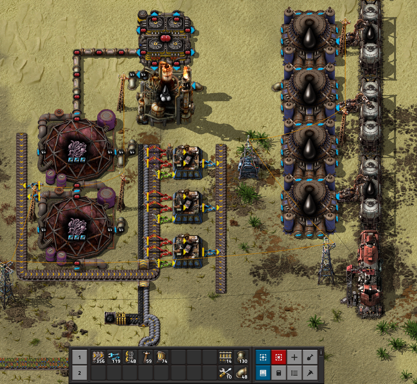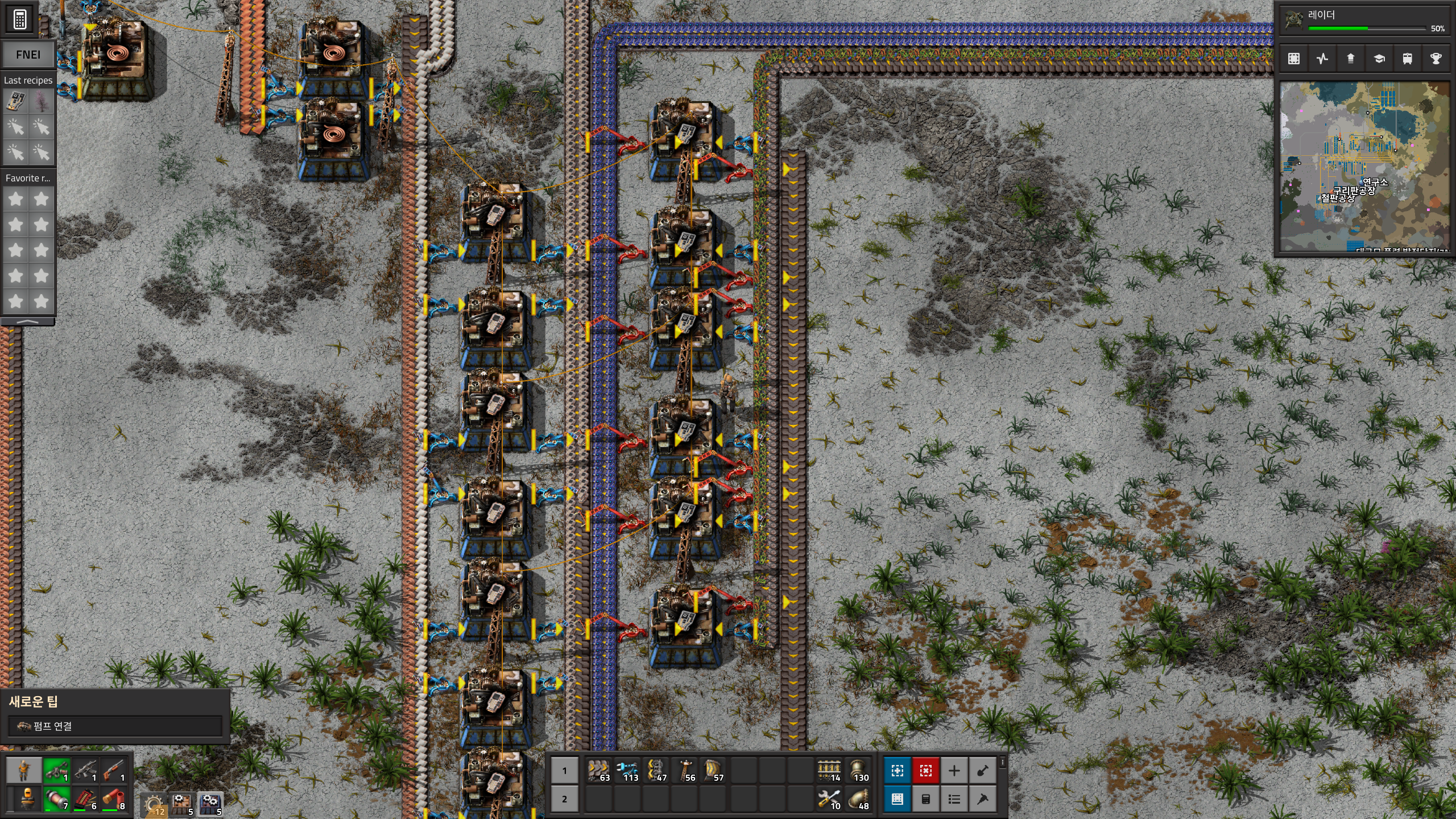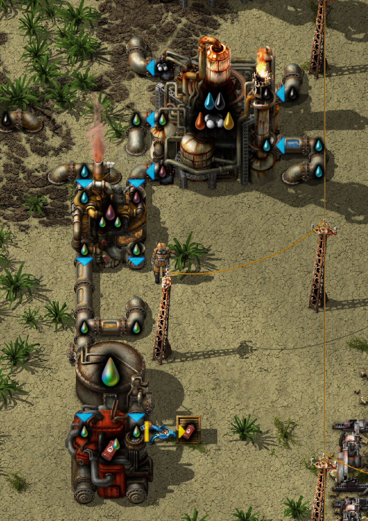 화염방사기 탄약은 어짜피 계속 생산이 필요없으니 화학단지근처에다가 원유를 연결해주고 철판은 철판공장에서 대충 들고와서 상자에다가 넣어주면 된다. 철판벨트를 끌고오는건 너무 귀찮은 일이다.