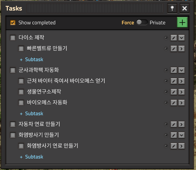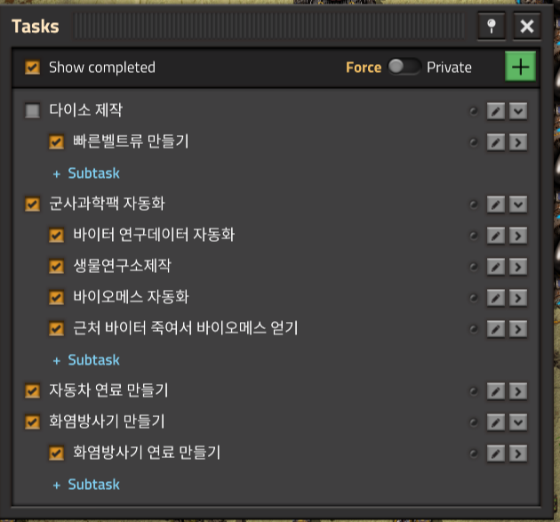 군사테크만들기 - 바이오매스자동화 - 생물연구소 만들기 - 연구에 필요한 군사테크 만들기 - 바이오매스 채취 - 바이터죽일 무기제작 및 바이터둥지 찾아다닐 자동차 제작 - 자동차연료 및 화염방사기 탄약 만들기의 흐름이다.