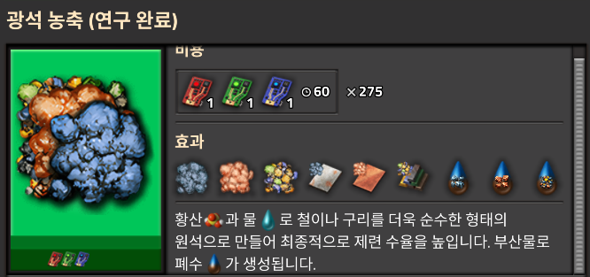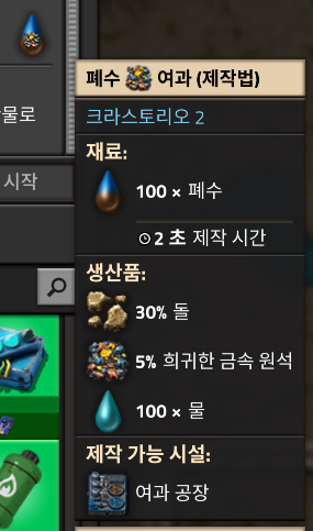 다행히 폐수는 폐수여과공정을 통해 30% 확률로 돌, 5% 확룰호 희귀한 금속원석을 다시 얻을 수 있다.