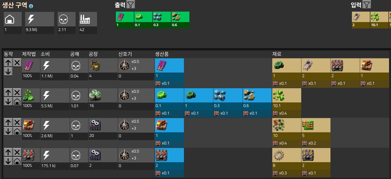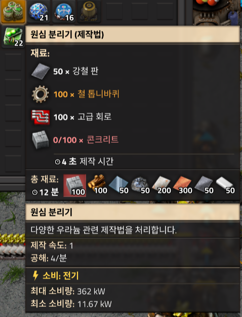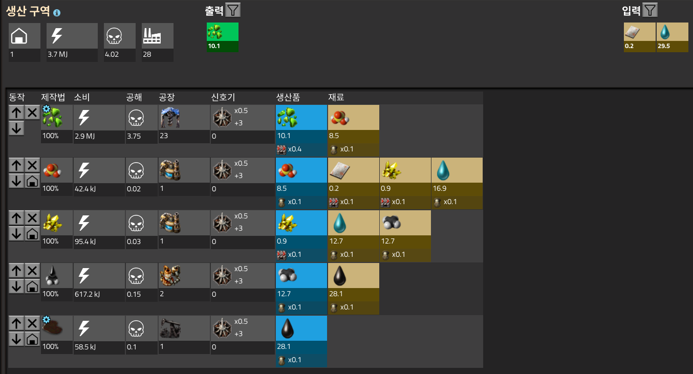 그리고 우라늄생산을 위한 광석채취를 위해 채광드릴 Mk2가 23개가 필요하고, 나머지 황산공장이나 석유가스 공장은 1~2개만 있어도 된다.