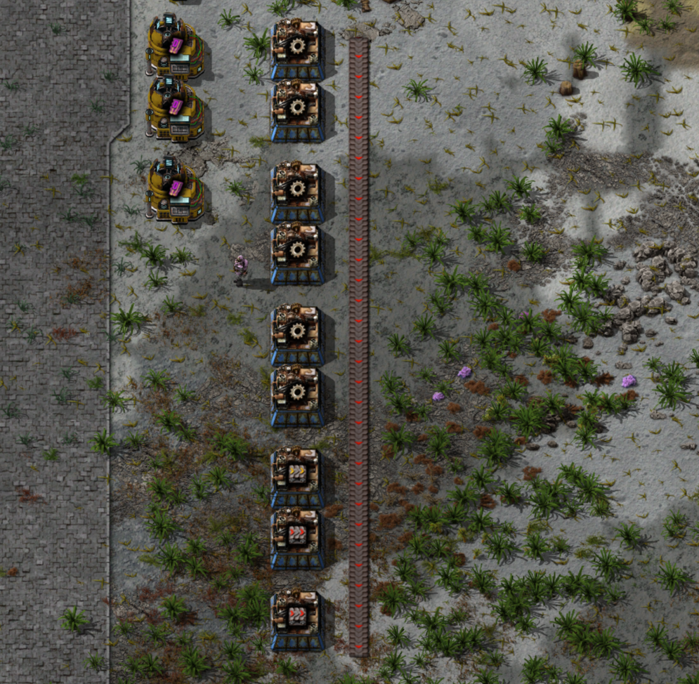 벨트용량이 충분한지라 일렬로 20개 공장을 놔둬도 됬었는데, 그렇게 되면 철도랑 겹쳐버려서 그냥 10개씩 두줄로 만들었다.