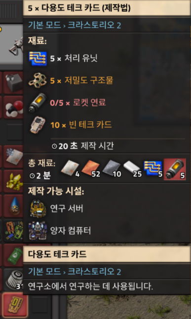 다용도테크카드를 만들기위해서는 처리유닛, 저밀도구조물, 로켓연료, 빈테크카드 총 4개의 재료가 필요하다.