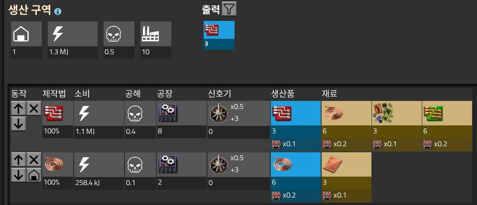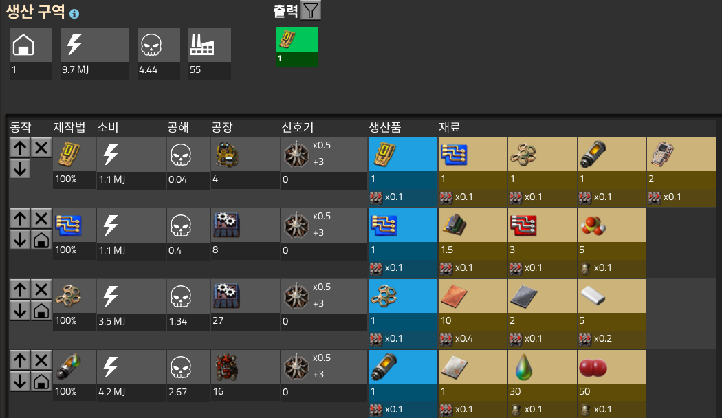 연소탑은 공해를 10/분 생산하고, 공해필터는 75/분 소모라서 1개만 있어도 되지만, 워낙 공해가 심해서 그냥 3개를 돌리기로 했다.