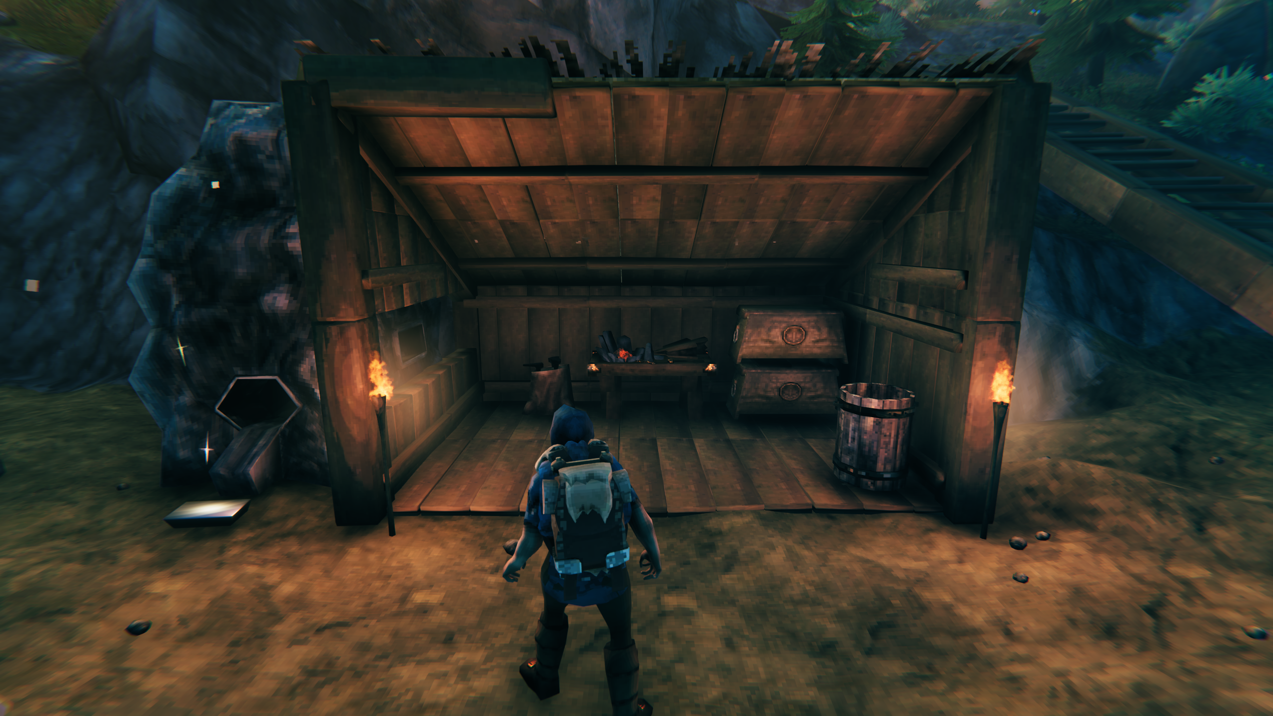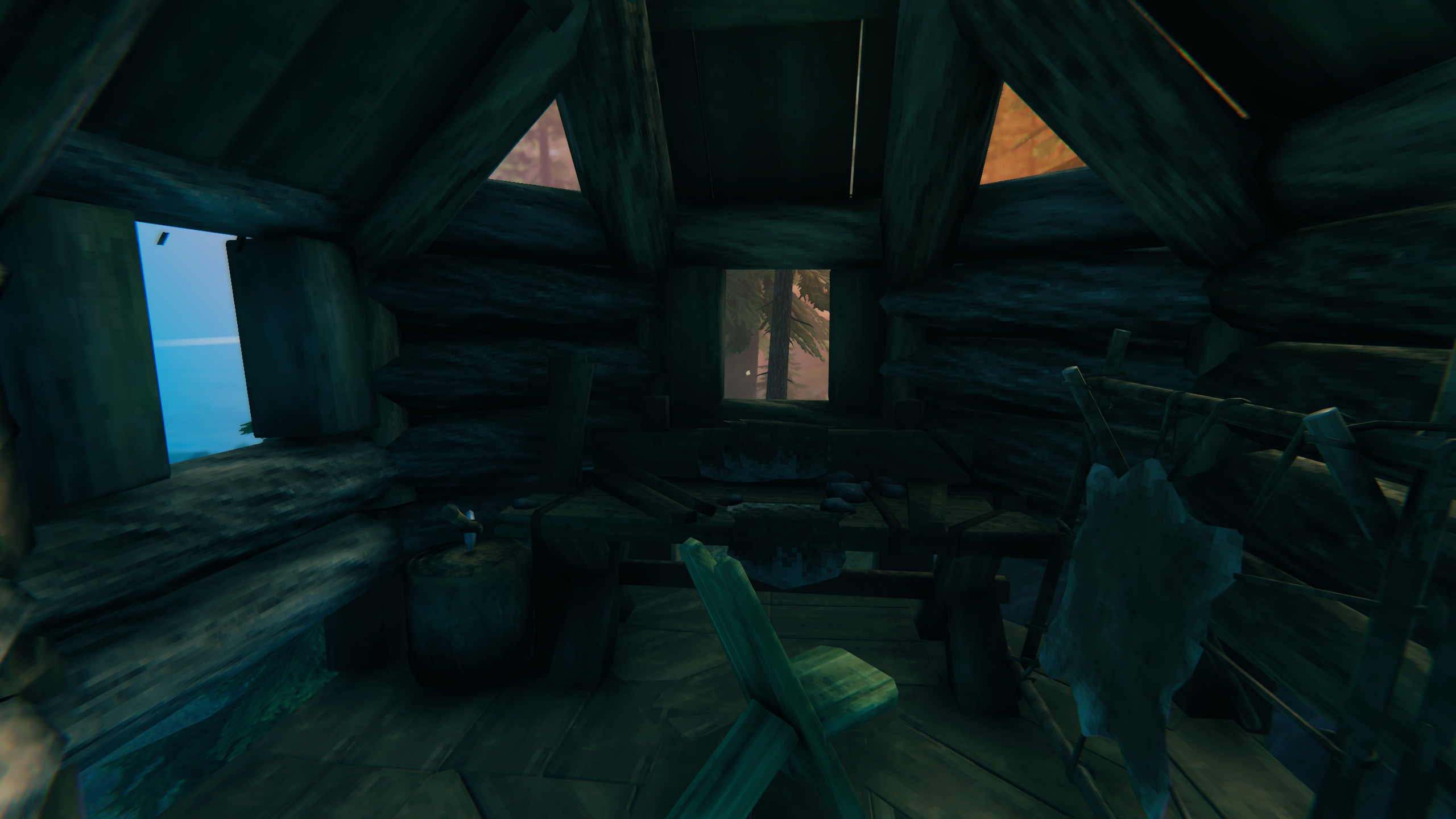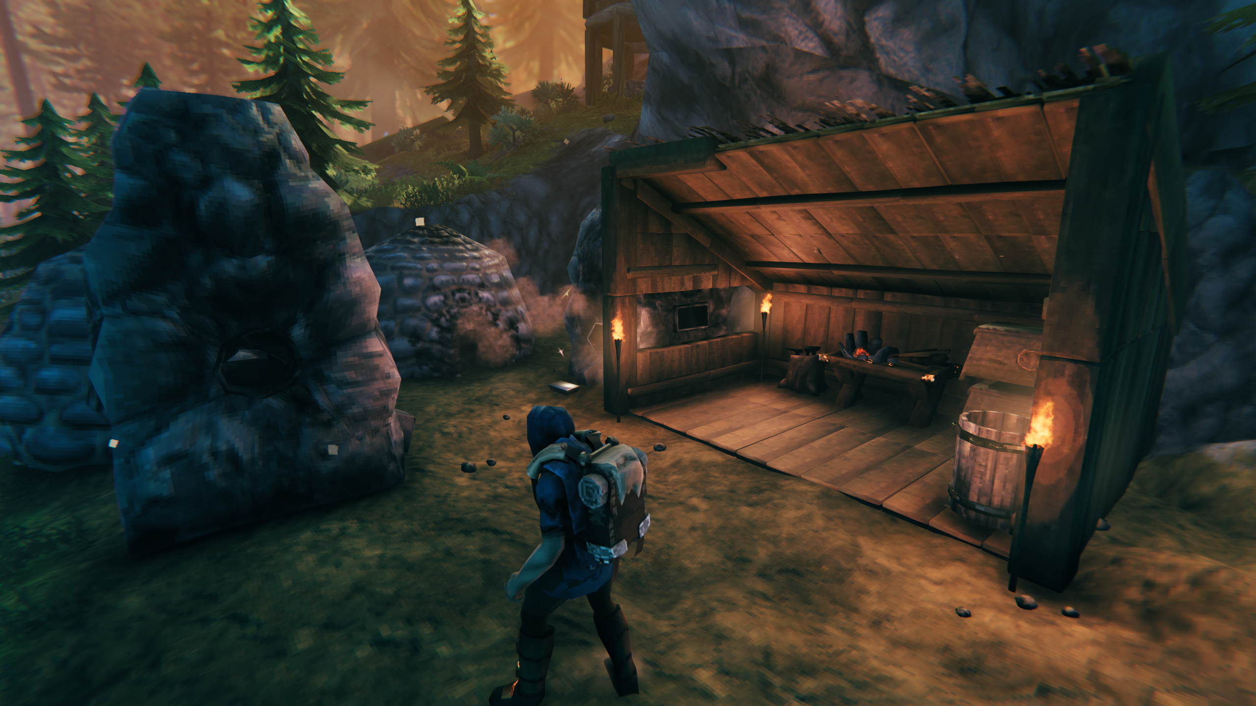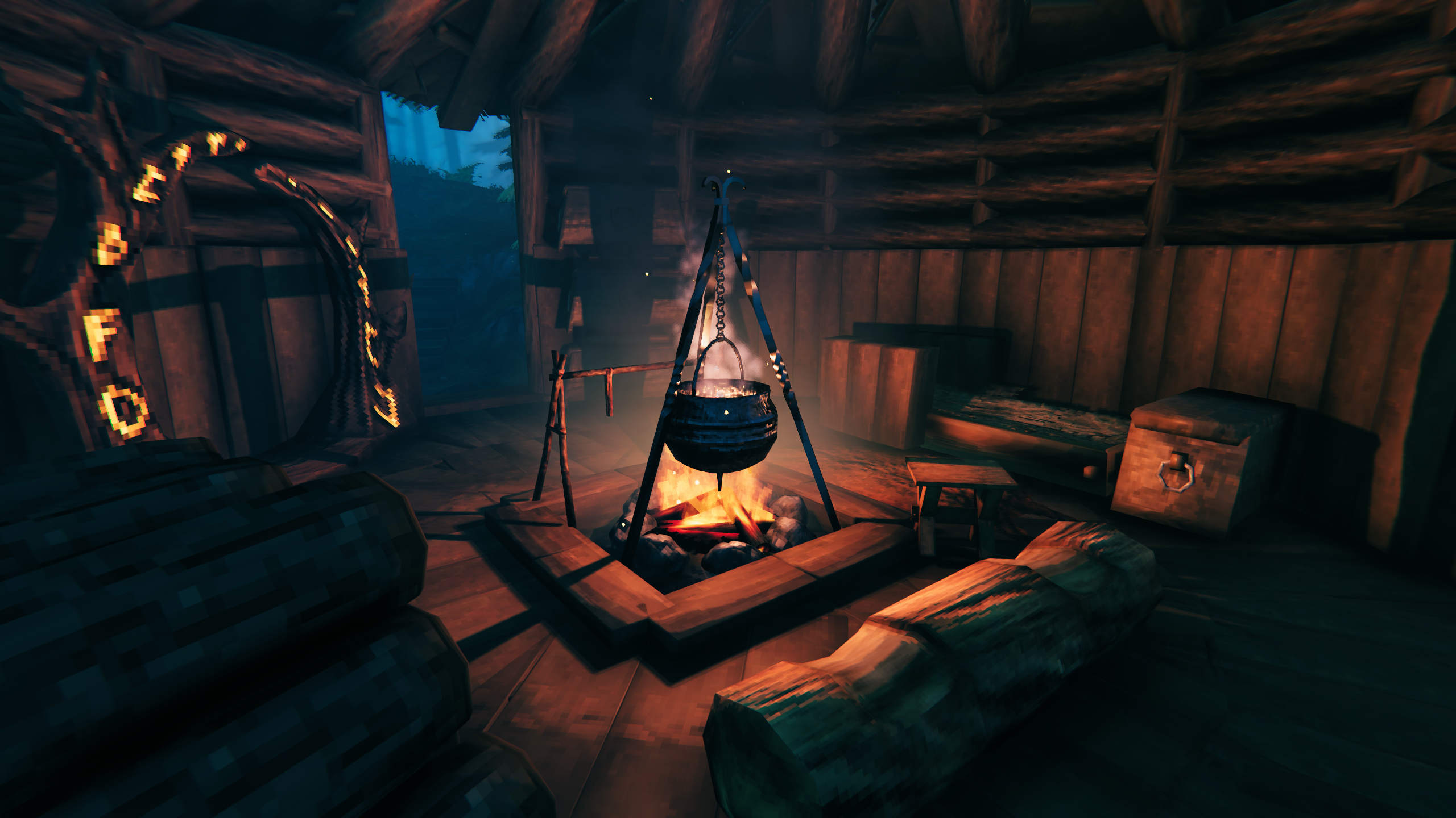 발헤임에서는 연기가 빠져나갈 구멍을 만들어줘야되기 때문에, 중간의 구멍은 연기가 빠져나가는 굴뚝 역할을 한다.