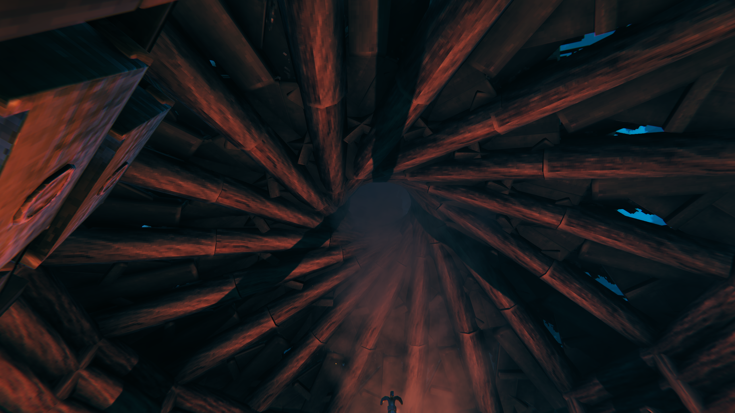 천장을 보면 여러개의 통나무가 나선형으로 연결되어 서로가 서로를 지지하는 형태로 지어졌다.(게임상으로는 그런 지지가 구현되진않았지만.)