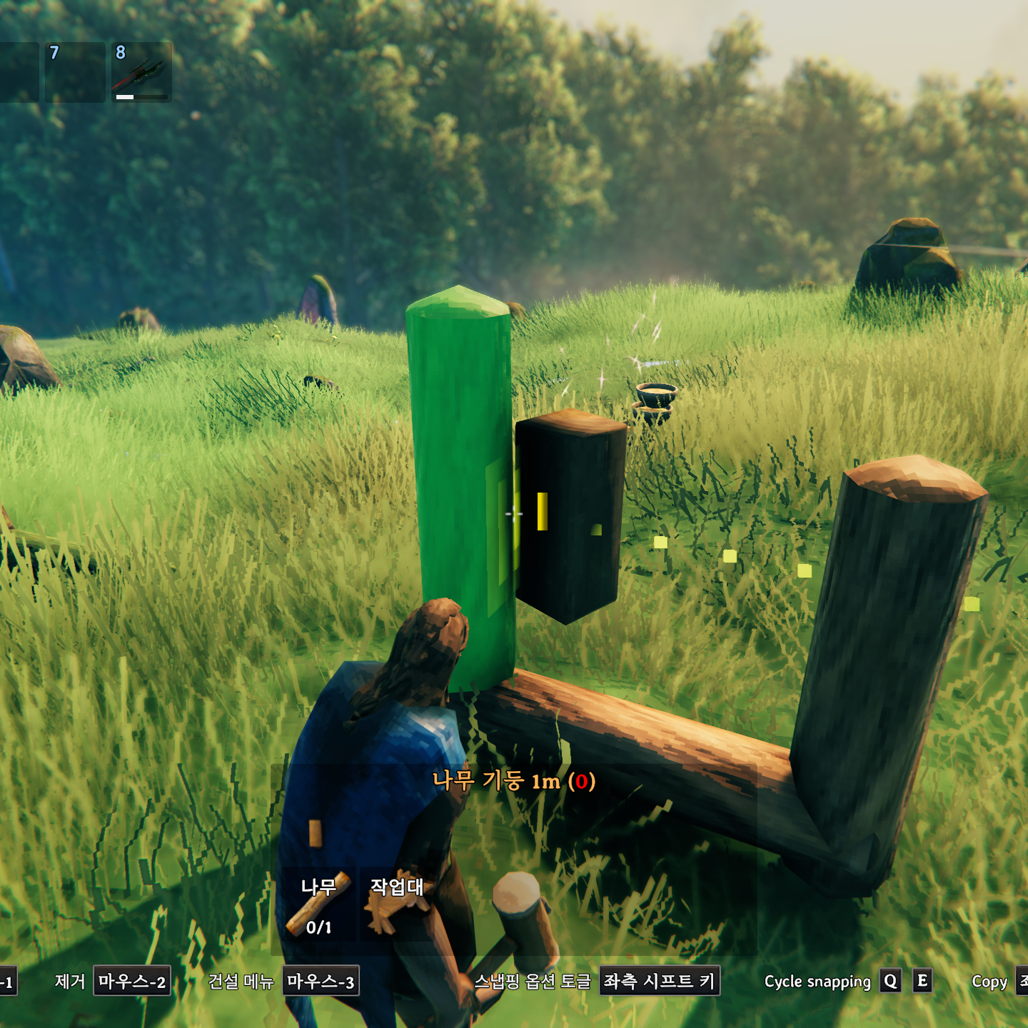 나무벽을 두르는건 조금 귀찮은데, 스냅핑 자동을 풀고 bottom1 내지 bottom2 상태에서 Shift키를 눌러 통나무 벽에 맞추어 설치해야한다.